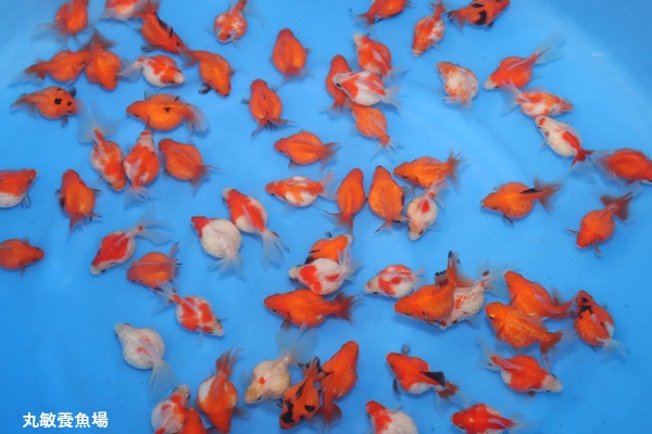木下産(更紗和金・三色和金)。加藤産桜錦。深見産ピンポンパール。長尾産墨朱文金。